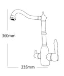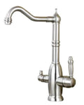 3-wegkraan britse stijl, drinkwaterkraan Technische details: Behuizing en hals: Materiaal: Messing Afwerking: Gesatineerd Ventiel: 1 van messing, 1 van kunststof Hendels: 2 van messing Wordt geleverd met:Installatieset inclusief: 2 flexibele...